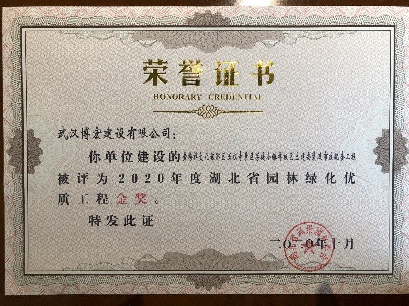 2020湖北省城市園林綠化優(yōu)質(zhì)工程金獎(jiǎng)獎(jiǎng)狀