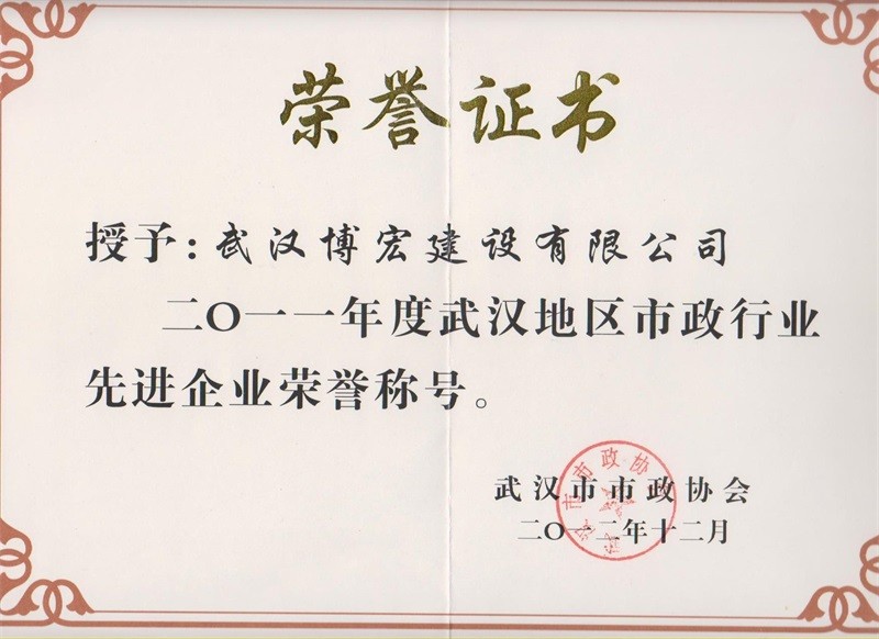 2011年度武漢地區(qū)市政行業(yè)先進(jìn)企業(yè)榮譽稱號
