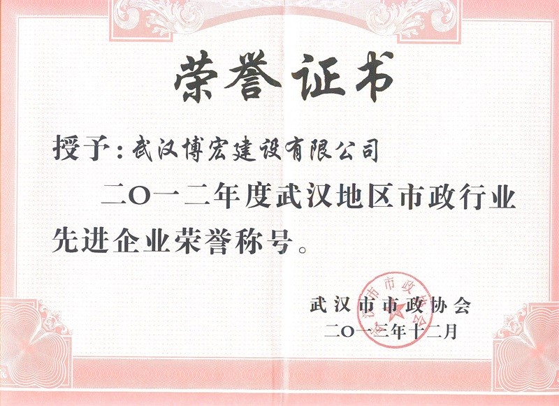 2012年度武漢地區(qū)市政行業(yè)先進(jìn)企業(yè)榮譽稱號