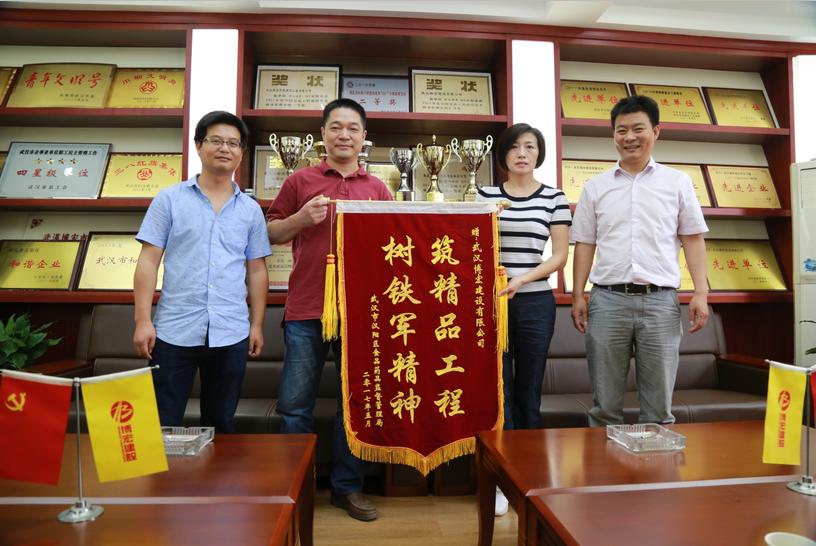 努力成就未來,精品贏得榮譽(yù)!6月14日,因金龍公館4-7樓裝修改造工程建設(shè)又快又好,漢陽(yáng)區(qū)食品藥品監(jiān)督管理局辦公室主任馬濤專程到訪博宏建設(shè),送來錦旗一面表示感謝!