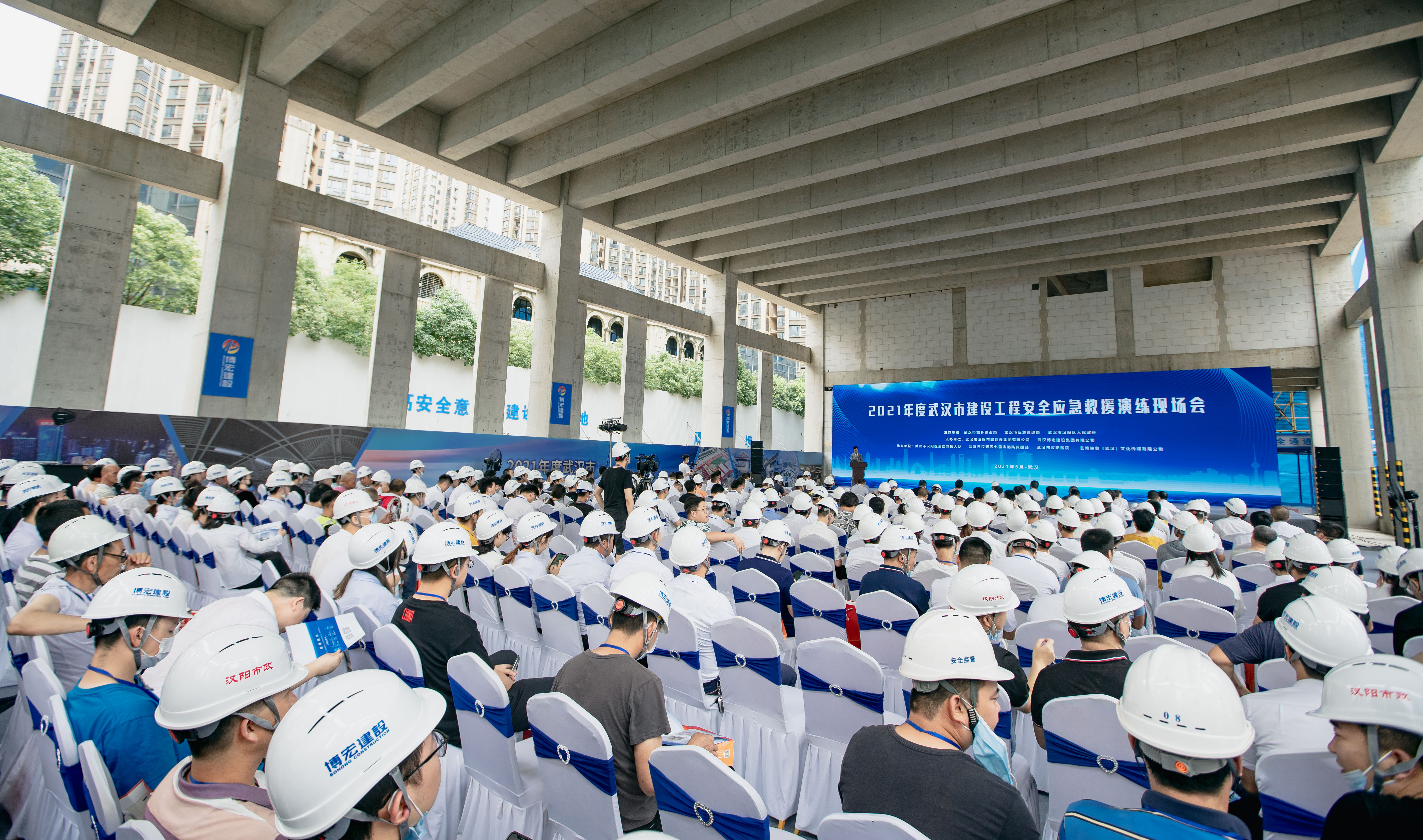 以全國第20個“安全生產(chǎn)月”為契機,“2021年度武漢市建設(shè)工程安全應(yīng)急救援演練現(xiàn)場會”活動在漢陽市政博宏公司漢陽市政建設(shè)大廈項目現(xiàn)場順利舉行。武漢市城鄉(xiāng)建設(shè)局副局長榮先國、武漢市應(yīng)急管理局副局長喻思源、武漢市漢陽區(qū)副區(qū)長蔡松、湖北省質(zhì)安總站副站長周偉、武漢市安全站站長楊劼、武漢建筑業(yè)協(xié)會秘書長李祥林、漢陽區(qū)建設(shè)局局長胡紅勝、漢陽區(qū)應(yīng)急管理局局長李漢光、各區(qū)建設(shè)局、相關(guān)建設(shè)單位及同行施工單位共計400余人參加本次活動。活動由漢陽市政集團公司、漢陽市政博宏公司共同承辦。