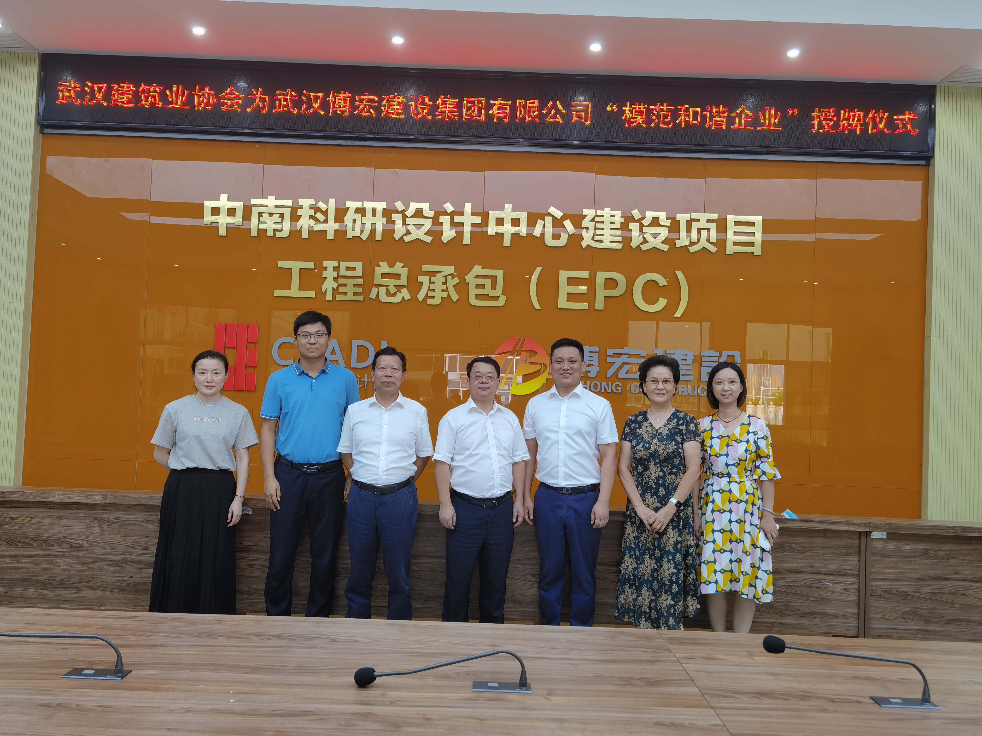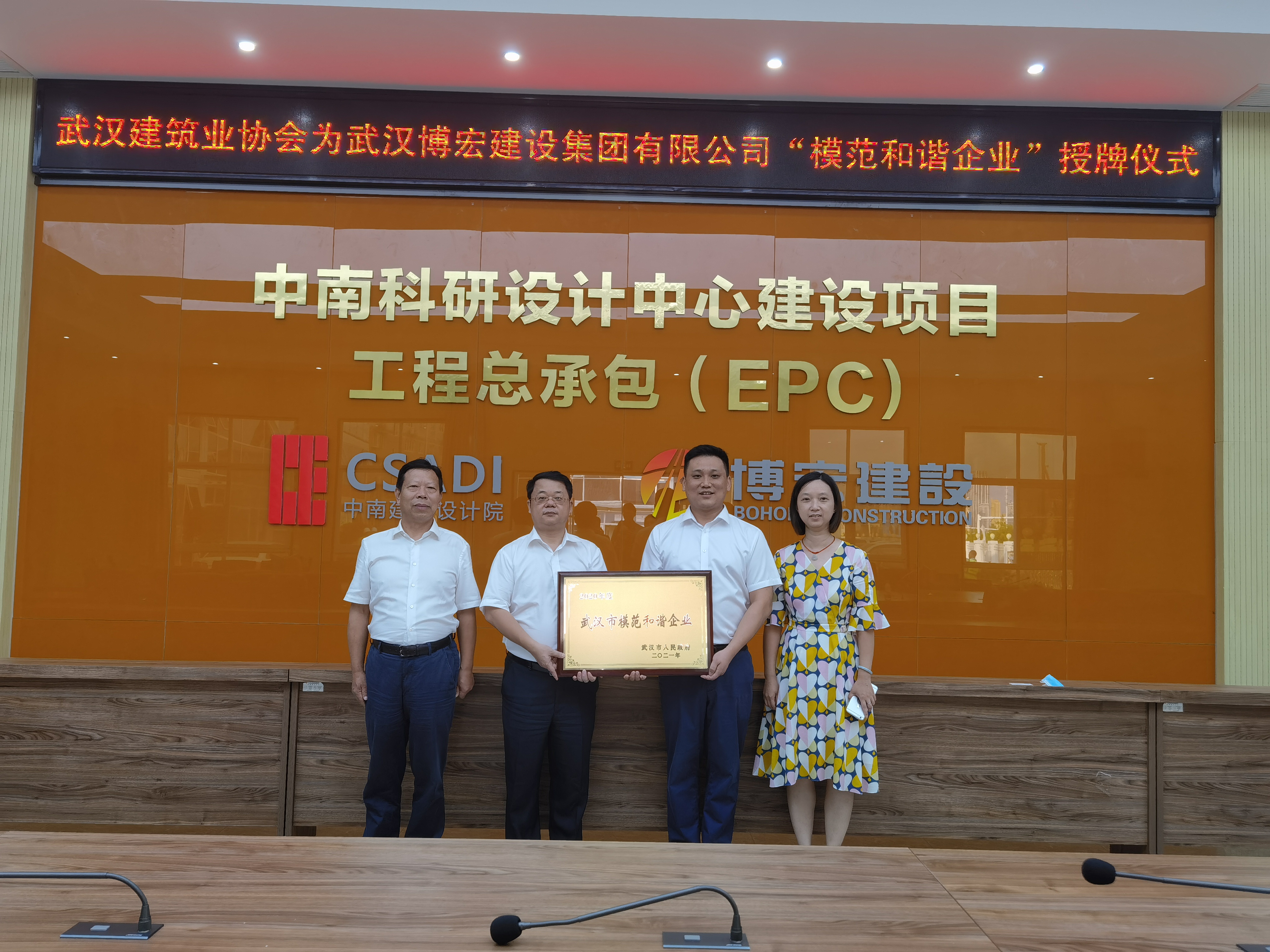 9月14日下午,博宏建設“武漢市模范和諧企業(yè)”授牌儀式在博宏建設承建的中南科研設計中心項目順利舉行。武漢建筑業(yè)協(xié)會副會長劉慶、秘書長李紅青、總工程師工作委員會副主任安維紅,博宏建設總經理蘇琦、黨支部副書記郭一清、總經理助理周昌文參加儀式。