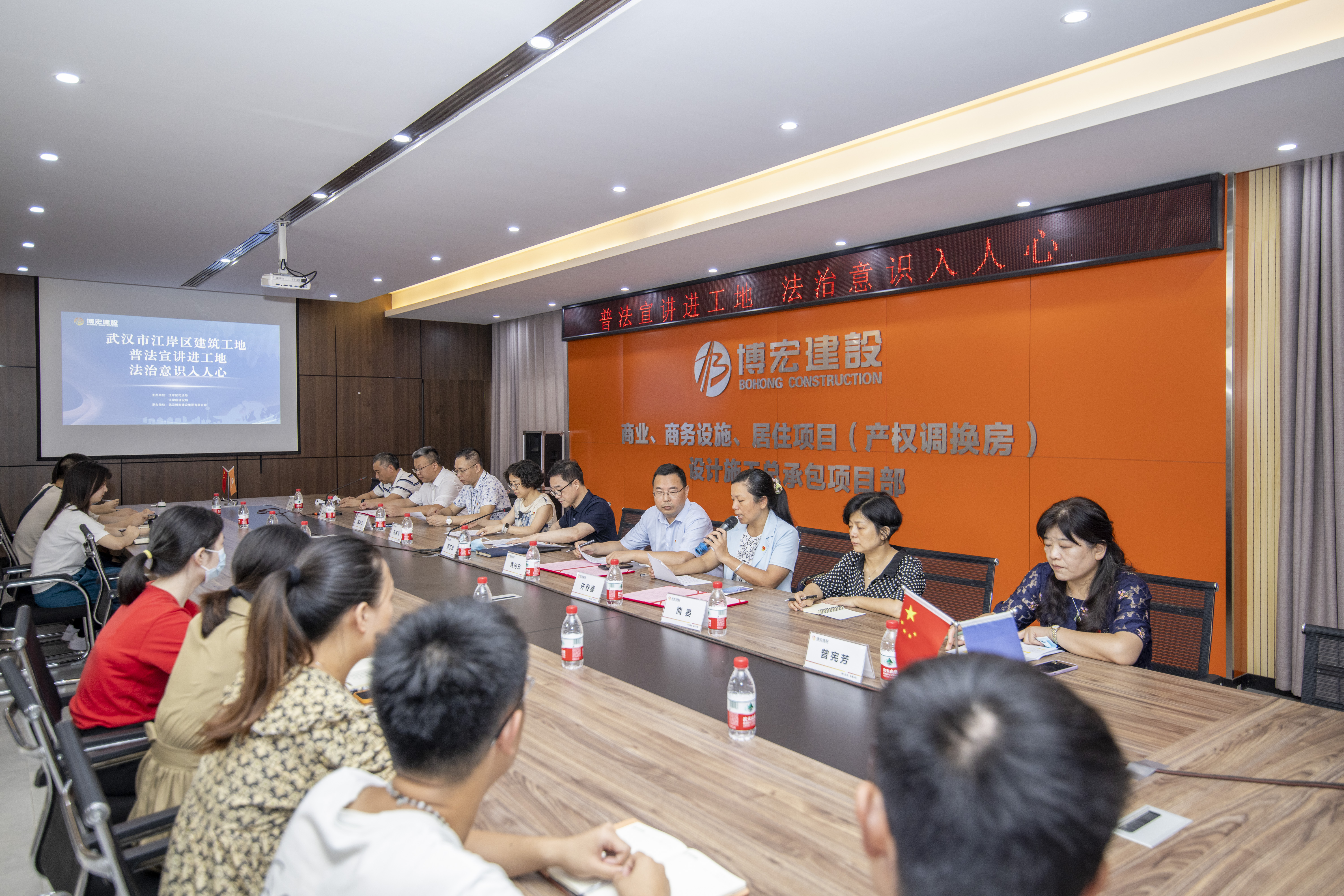 為切實(shí)保障建筑工人合法權(quán)益,提高各參建單位依法合規(guī)意識,樹立良好的法治觀念,7月7日上午,江岸區(qū)“普法宣講進(jìn)工地,法治意識入人心”活動在博宏建設(shè)集團(tuán)承建的商業(yè)、商務(wù)設(shè)施、居住項(xiàng)目(產(chǎn)權(quán)調(diào)換房)舉行。江岸區(qū)司法局黨組書記、局長周萬青,江岸區(qū)建設(shè)局黨委委員、副局長黃向東,江岸區(qū)建管站黨支部書記、站長王衛(wèi)綱等相關(guān)領(lǐng)導(dǎo)和相關(guān)專業(yè)律師參加了此次活動?;顒硬捎镁€上線下相結(jié)合的方式,全區(qū)70余家項(xiàng)目工地、近2000名建筑工人線上觀看了直播。