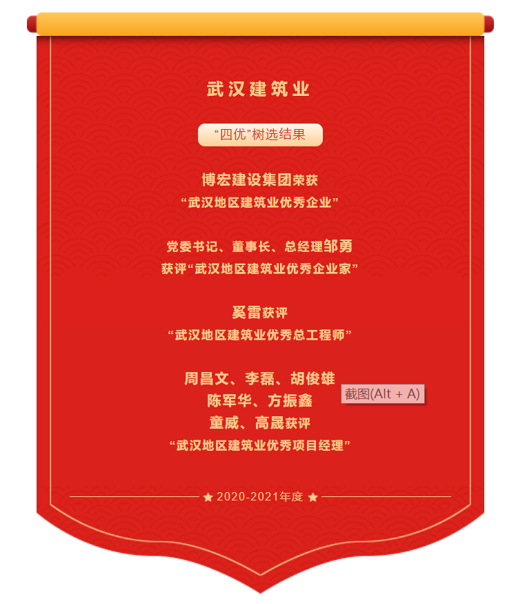? ? ? ? 近日,武漢建筑業(yè)協(xié)會發(fā)布2020-2021年度武漢地區(qū)建筑業(yè)優(yōu)秀企業(yè)、優(yōu)秀企業(yè)家、優(yōu)秀總工程師、優(yōu)秀項目經理(以下稱為“四優(yōu)”)選樹結果。經會員單位自主申報、協(xié)會組織專家評審、主管部門復核、武漢建協(xié)三季度會長辦公會審議通過并在協(xié)會網站進行公示,“四優(yōu)”選樹結果名單火熱出爐。博宏建設集團榮獲“武漢地區(qū)建筑業(yè)優(yōu)秀企業(yè)”;黨委書記、董事長、總經理鄒勇獲評“武漢地區(qū)建筑業(yè)優(yōu)秀企業(yè)家”;奚雷獲評“武漢地區(qū)建筑業(yè)優(yōu)秀總工程師”;周昌文、李磊、胡俊雄、陳軍華、方振鑫、童威及高晟獲評“武漢地區(qū)建筑業(yè)優(yōu)秀項目經理”。