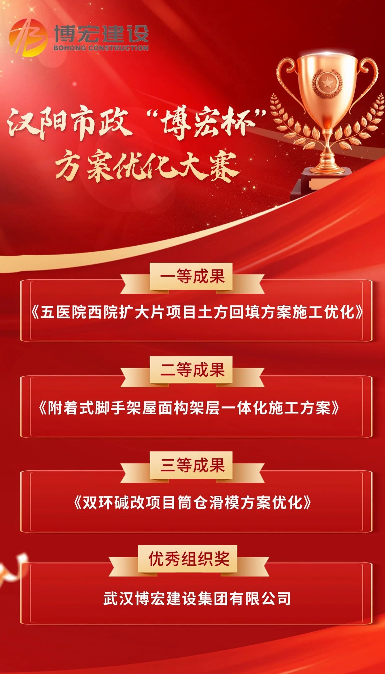 12月24日下午,漢陽市政“博宏杯”方案優(yōu)化大賽在漢陽市政建設(shè)大廈205會議室順利舉行,本次比賽以“技術(shù)賦能項目生產(chǎn)”為主題,經(jīng)過現(xiàn)場匯報評選,博宏建設(shè)集團(tuán)斬獲1項一等成果,1項二等成果,1項三等成果,與此同時,公司獲評優(yōu)秀組織單位。